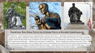 В 1832 год — власти Женевы решили переименовать остров в честь Руссо — философа, родившегося в Женеве и, согласно городским легендам, любившего прогуливаться здесь. Монумент был установлен в 1834 году, изготовил его скульптор Джеймс Прадье. Памятник Жану-Жаку Руссо установили на острове по ряду причин, отражающих сложные отношения города со своим знаменитым уроженцем. Выбор места неслучаен и символичен. Власти города долгое время относилась к Руссо с противоречивыми чувствами. Хотя он родился здесь, власти преследовали его за политические и религиозные взгляды, а его книги сжигали на площади. Установка памятника на острове — спустя десятилетия после его смерти (в 1834 году) — стала символом признания его величия и примирения города с его бунтарским духом.