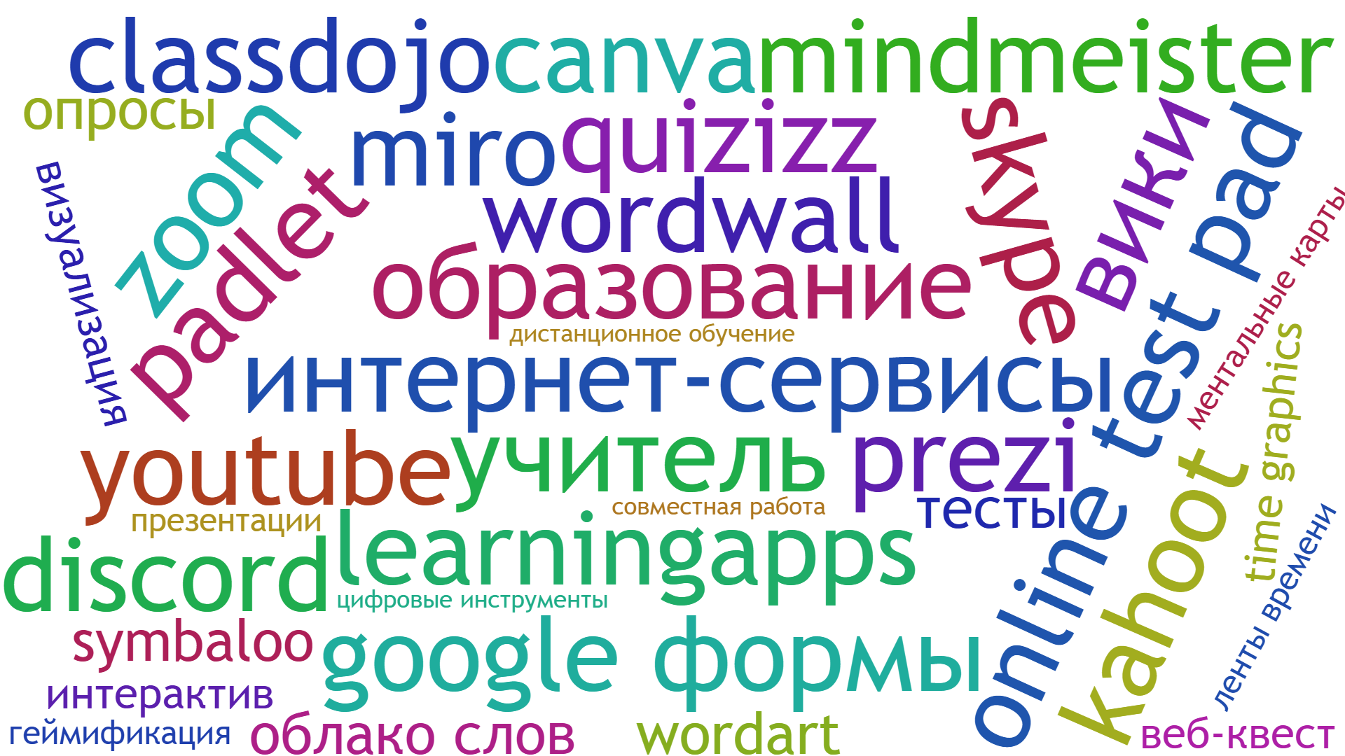 | текущий | 18:52, 23 марта 2026 | 1920 × 1080 (461 КБ) | Morozovasasha (обсуждение | вклад) | thumb|center|Облако слов "Интернет-сервисы в работе учителя" | |